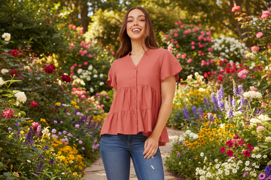 Effortless elegance meets versatile styling with this Tiered button-through top in a warm clay tone. The thoughtful layered design creates visual depth and dimension, while the full button front allows for customizable wear—button up completely for polished occasions or leave partially undone for relaxed sophistication. Crafted for the modern wardrobe, this piece transitions seamlessly from office to weekend, pairing beautifully with tailored trousers, denim, or skirts. A refined essential that elevates any ensemble.
