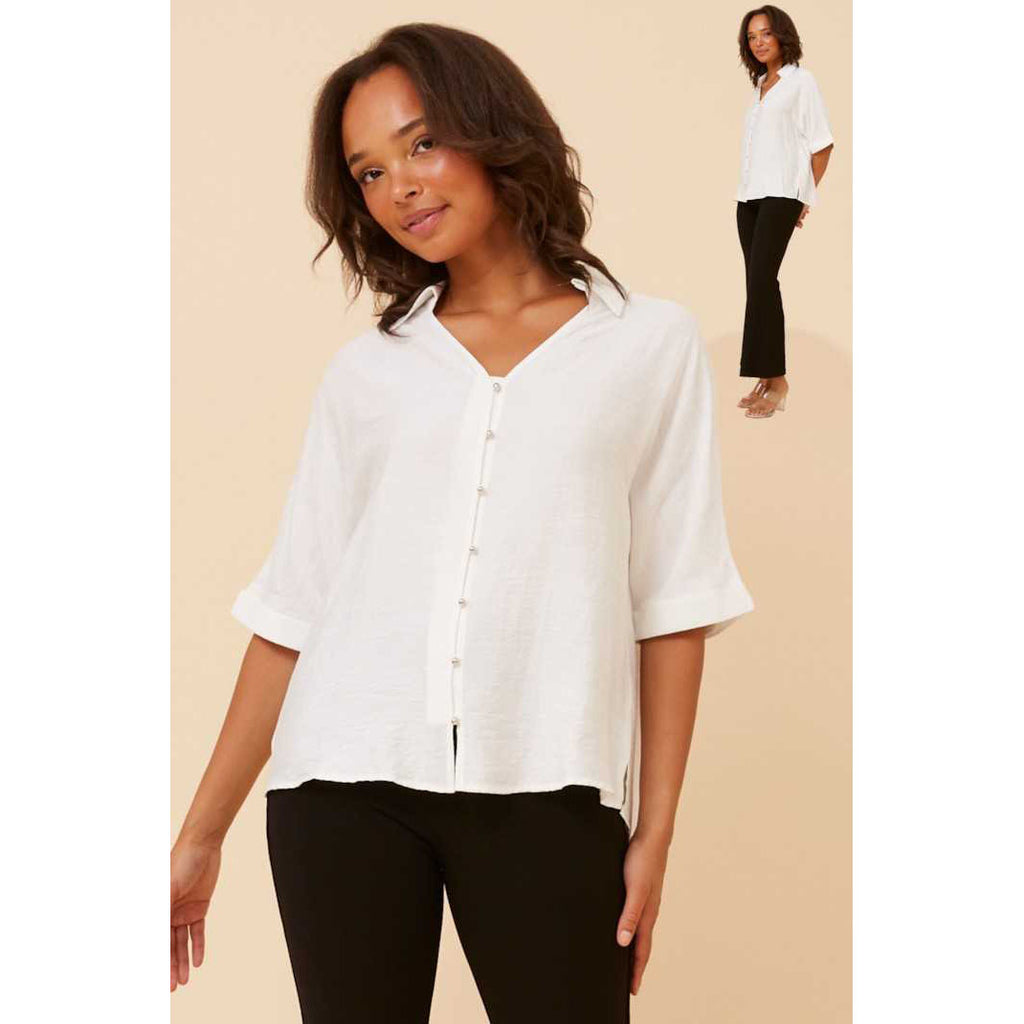Effortless style meets everyday comfort in this white button-through shirt. Perfect for layering or wearing solo, the short sleeves keep things breezy while the classic button front adds a touch of timeless charm. Whether you're dressing up for brunch or keeping it casual, this versatile piece transitions seamlessly from day to night. A wardrobe essential that works as hard as you do.