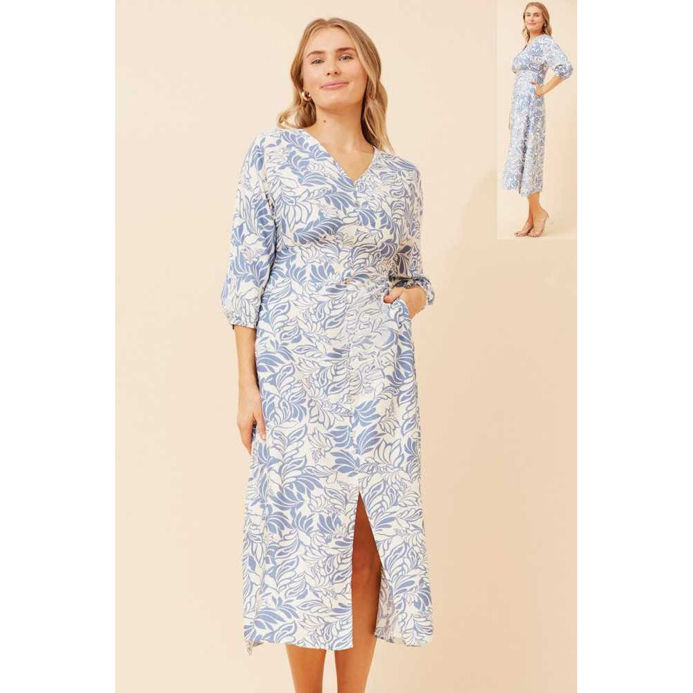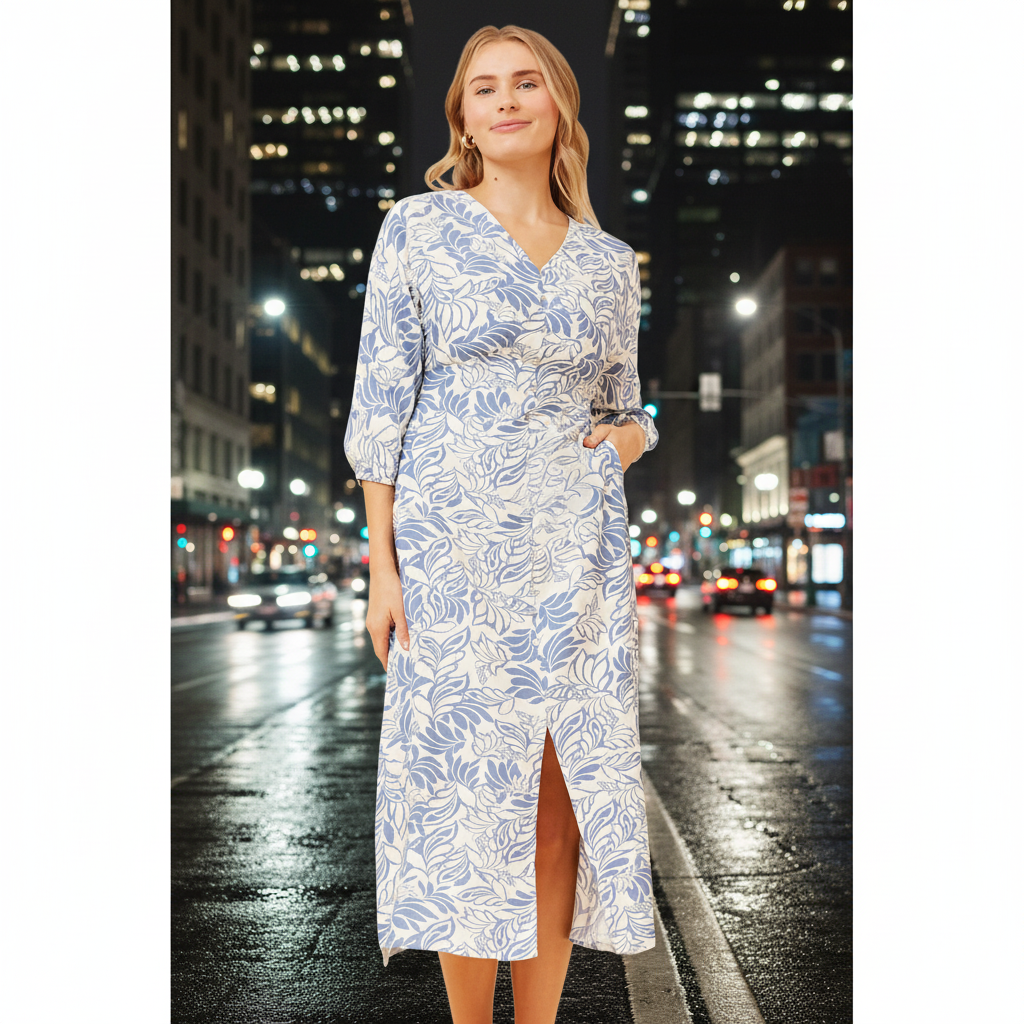 Elevate your wardrobe with this sophisticated mid-sleeve dress, crafted from luxuriously soft blue silky viscose. The graceful front split adds contemporary flair while maintaining refined elegance, making it perfect for both professional settings and evening occasions. The fluid fabric drapes beautifully against the body, offering comfort without compromising on style. A versatile piece that transitions seamlessly from day to night, this dress embodies modern sophistication with timeless appeal.