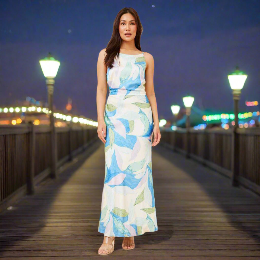 This blue satin printed sleeveless maxi dress offers a graceful silhouette with its flowing fabric and elegant design. Perfect for warm days or special occasions, it combines comfort with style, allowing you to move freely while looking effortlessly chic. The vibrant print adds a touch of personality, making it a versatile addition to your wardrobe.