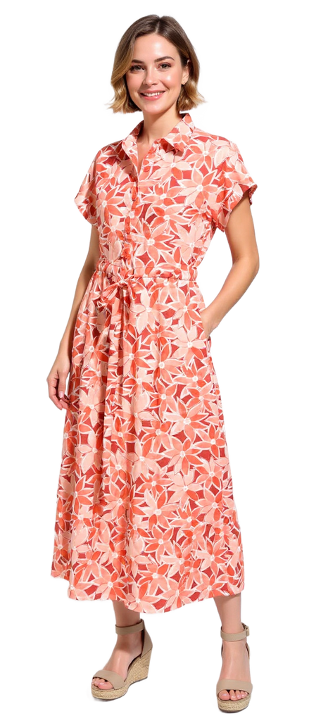 This Mocha Palms Print Dress offers comfortable style with its 50% cotton and 50% rayon blend, ensuring a soft, breathable feel. The relaxed drop shoulder design and drawstring waist allow for an easy, flattering fit. Functional buttons run down to the waist, and convenient side pockets add practicality, making this dress a versatile choice for everyday wear.