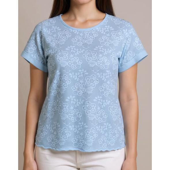 This Cap Sleeve Embroidered Top in off white combines comfort and style with its soft 100% cotton front, featuring delicate embroidery and a scalloped hem for a subtle feminine touch. The drop shoulder design and stretchy lycra back and cuffs ensure a relaxed fit that moves with you, making it perfect for everyday wear. Its breathable fabric and thoughtful details provide both ease and elegance in one versatile piece.