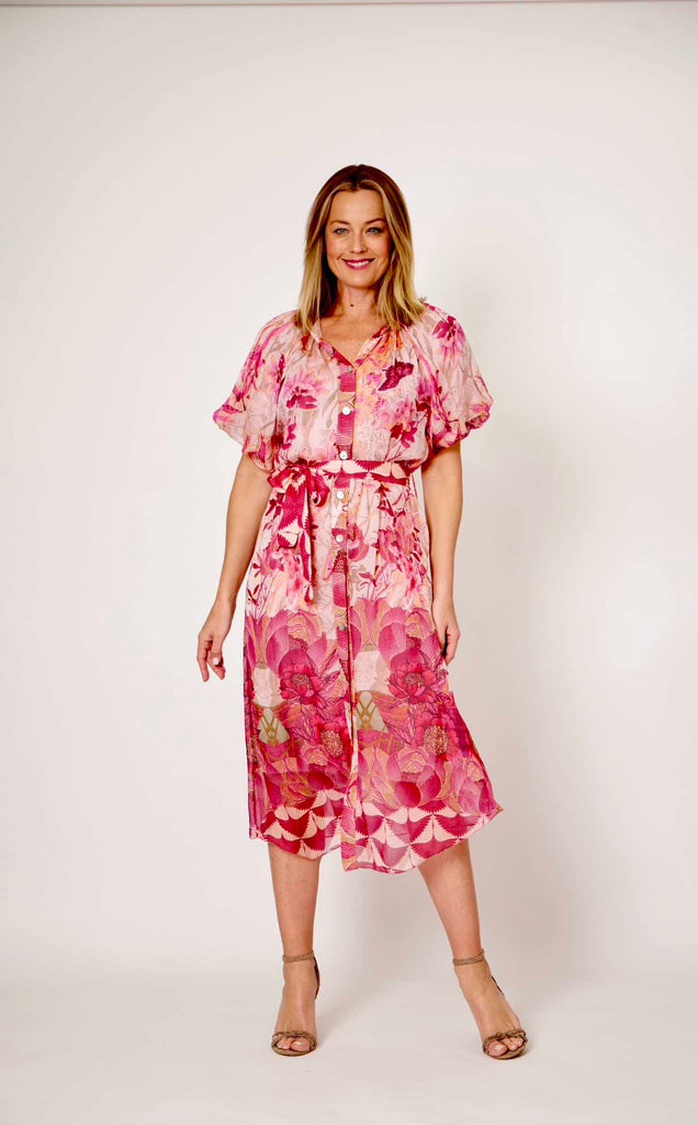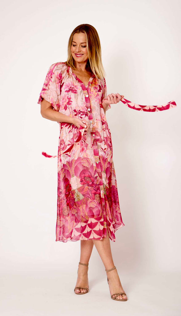 Chinese Collar Belted Shirt Dress - Multi Pink Floral