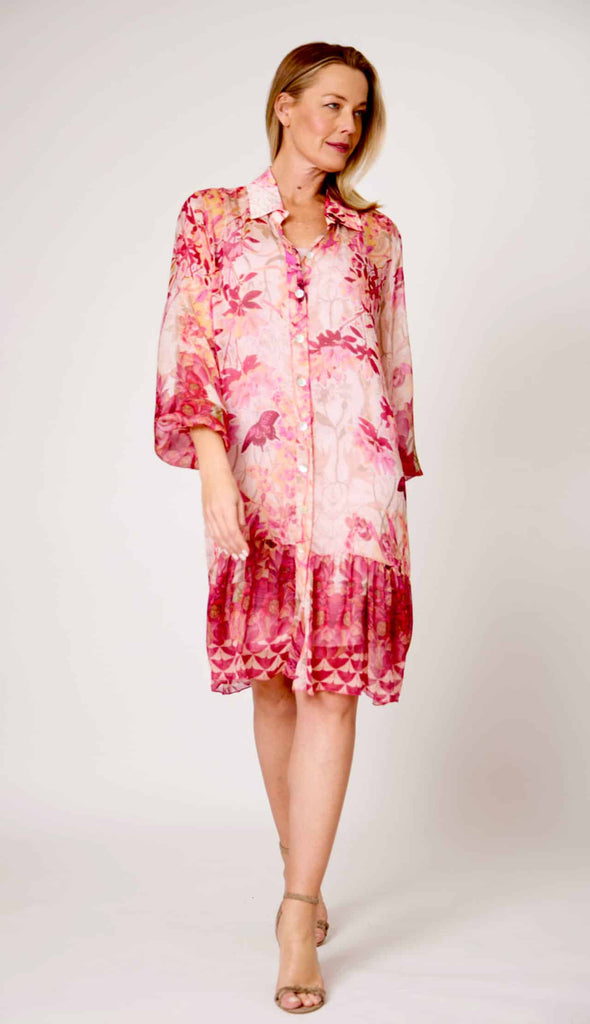 Make a bold statement in this striking shirt dress that refuses to blend in. Constructed from a sumptuous silk and viscose blend, this piece commands attention with its audacious multi-pink and fuchsia floral print. The long sleeves and knee-length cut deliver understated sophistication, while the included slip keeps you feeling confident and unrestricted. Whether you're pushing boundaries at work or turning heads at social events, this dress proves that daring style doesn't require compromise. Own your presence.