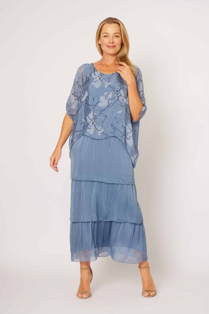 Experience the epitome of luxury with our Layered Silk Dress in Blue. Made from a blend of 30% silk and 70% viscose, this dress exudes sophistication with its multi-layered design and intricately printed upper body. Elevate your style and make a statement with this exquisite piece.