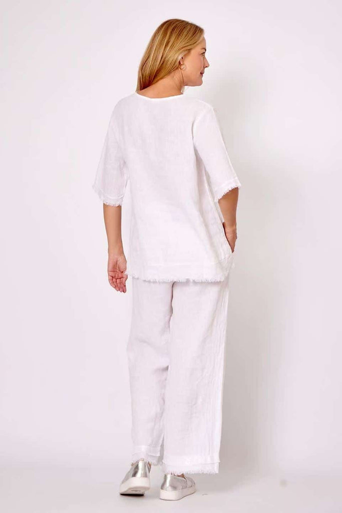 Elevate your everyday wardrobe with this breezy linen top that's anything but basic. Crafted from 100% linen, it keeps you cool and comfortable while the shimmering sequin trim adds just the right amount of sparkle to turn heads. Perfect for casual outings or dressing up with your favourite bottoms, this versatile white piece is your new go-to for effortless style with a touch of glamour.