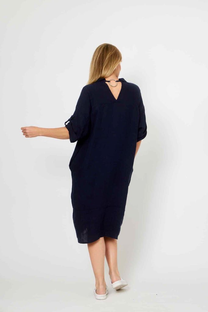 This navy linen dress strikes the perfect balance between relaxed and refined. Made from 100% pure linen, it's naturally breathable and comfortable for everyday wear. The front button-down design lets you adjust the neckline to suit your mood, while the metal ring accent at the back adds an understated edge. Throw it on with sneakers for casual outings or pair it with simple jewellery for a more polished look—versatility that works season after season.
