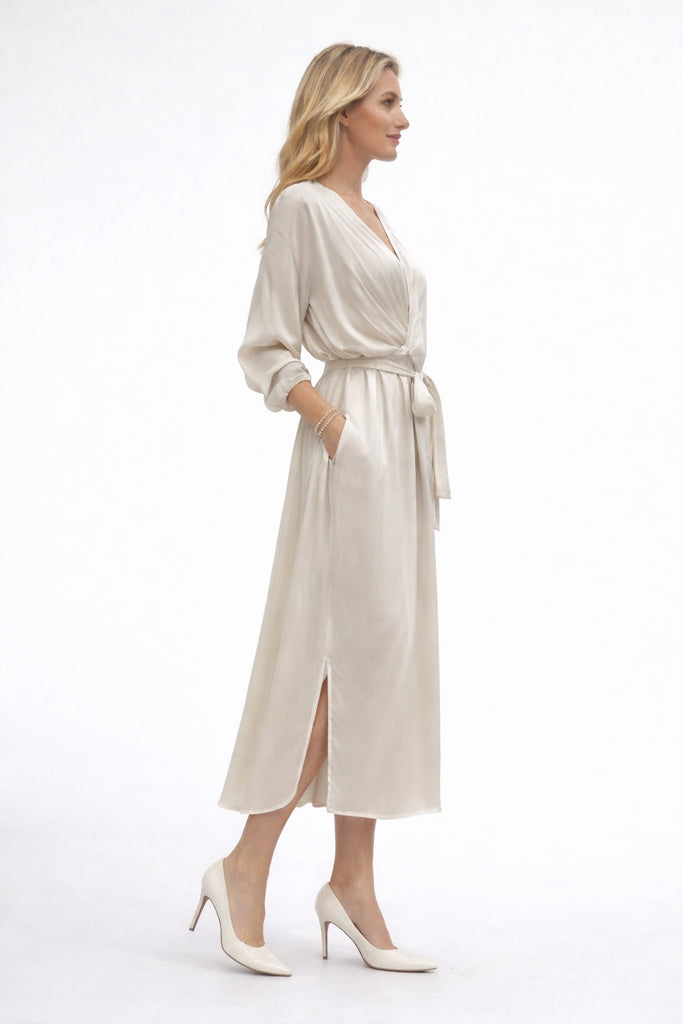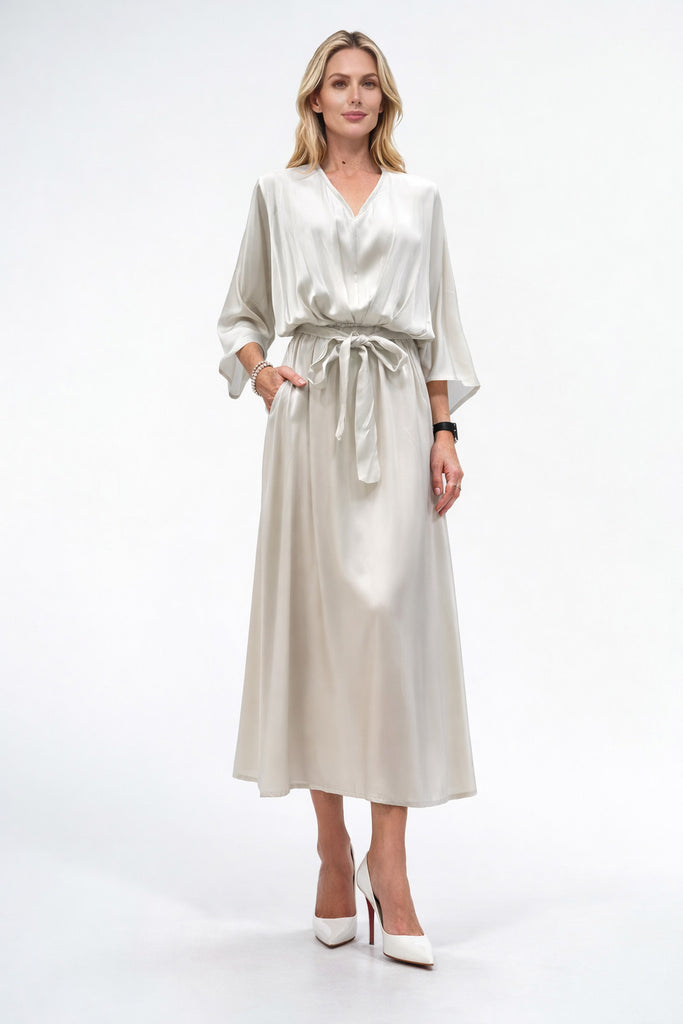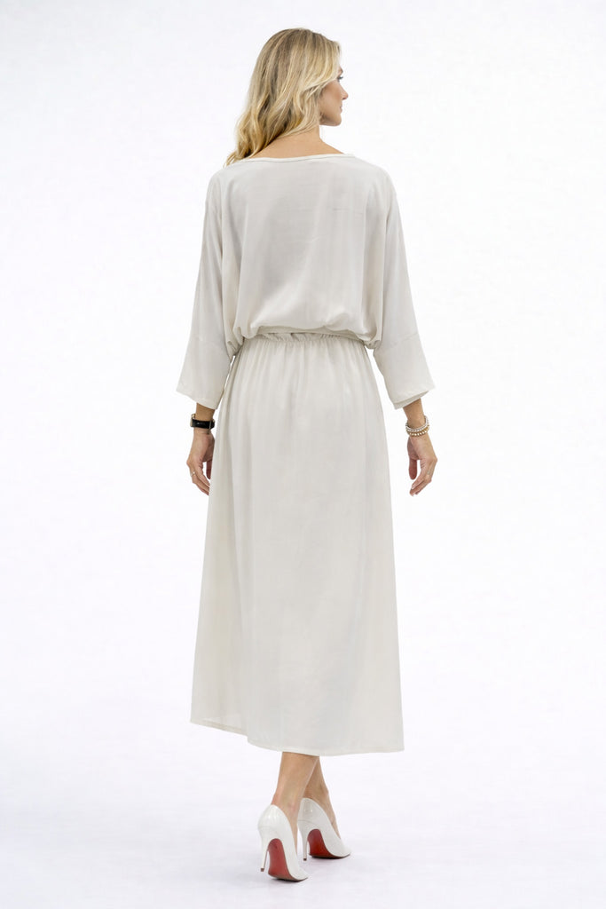 Embrace effortless elegance with this luxurious 100% viscose kimono style dress in Sabbia. The fluid fabric drapes beautifully, creating a relaxed yet refined silhouette perfect for warm weather styling. The kimono cut offers versatile layering options, while the neutral Sabbia tone pairs seamlessly with any wardrobe. Soft, breathable viscose ensures all-day comfort without compromising on sophistication. An understated essential for contemporary dressing.