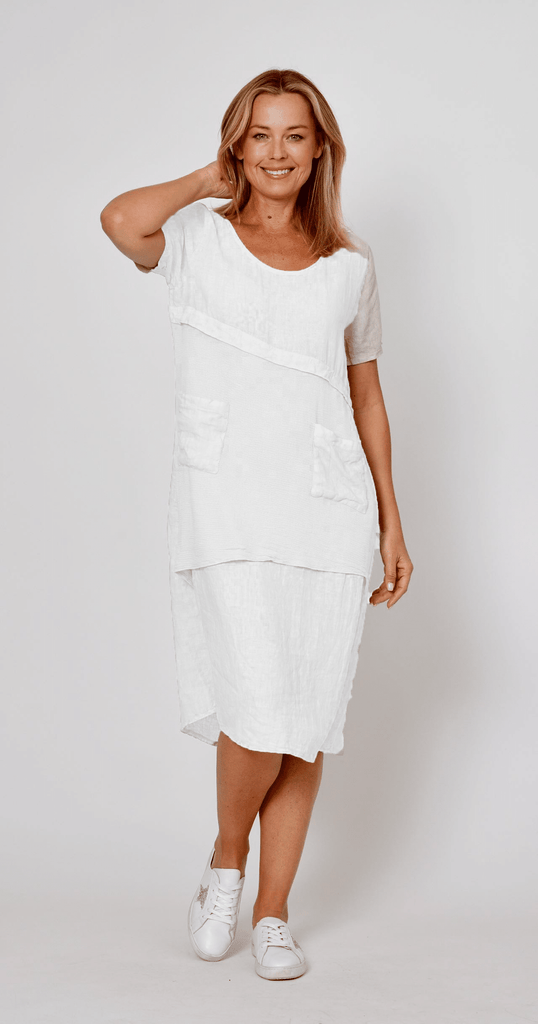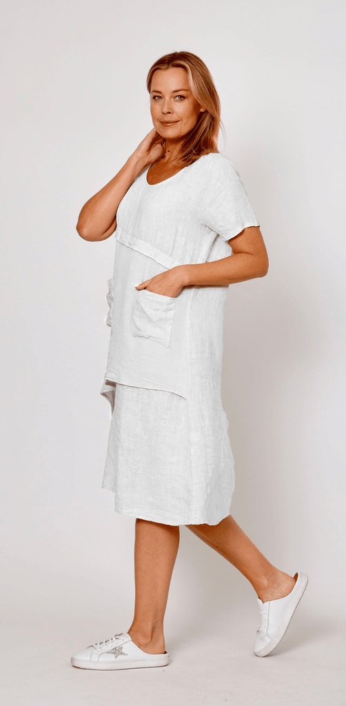 Effortless summer style meets practical design in this breezy linen dress. Crafted from 100% linen for breathable comfort, it features clever mesh panel pockets that add a modern twist while keeping your essentials close. Perfect for casual days when you want to look put-together without trying too hard. Slip it on and go—whether you're heading to the shops or catching up with friends.