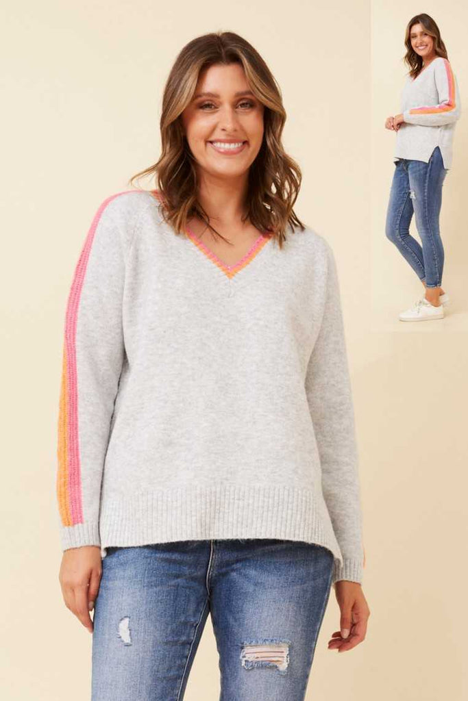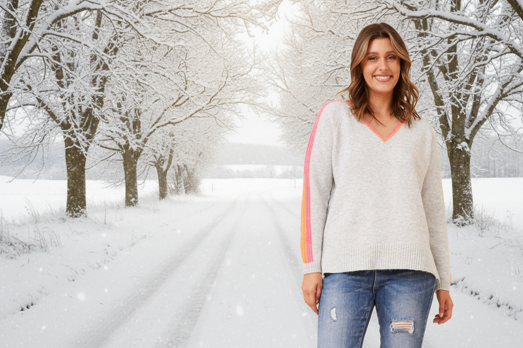 Effortless elegance meets modern style with this light grey v-neck long sleeve top. The distinctive strip detail running down the sleeve adds a contemporary edge to an otherwise classic silhouette. Perfect for layering or wearing solo, this versatile piece transitions seamlessly from casual weekends to smart-casual workdays. The soft fabric drapes beautifully while the v-neckline flatters most body types. A wardrobe essential that pairs with everything from jeans to tailored trousers.