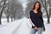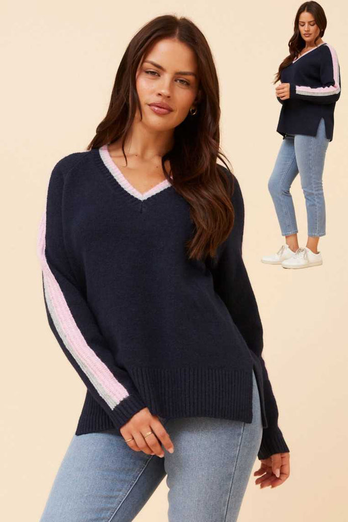 Effortless elegance meets modern style with this navy v-neck long sleeve top. The distinctive strip detail running down the sleeve adds a contemporary edge to an otherwise classic silhouette. Perfect for layering or wearing solo, this versatile piece transitions seamlessly from casual weekends to smart-casual workdays. The soft fabric drapes beautifully while the v-neckline flatters most body types. A wardrobe essential that pairs with everything from jeans to tailored trousers.