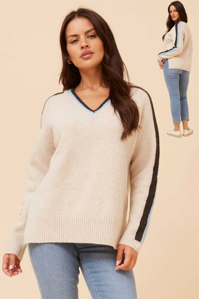 Effortless elegance meets modern style with this oatmeal v-neck long sleeve top. The distinctive strip detail running down the sleeve adds a contemporary edge to an otherwise classic silhouette. Perfect for layering or wearing solo, this versatile piece transitions seamlessly from casual weekends to smart-casual workdays. The soft fabric drapes beautifully while the v-neckline flatters most body types. A wardrobe essential that pairs with everything from jeans to tailored trousers.